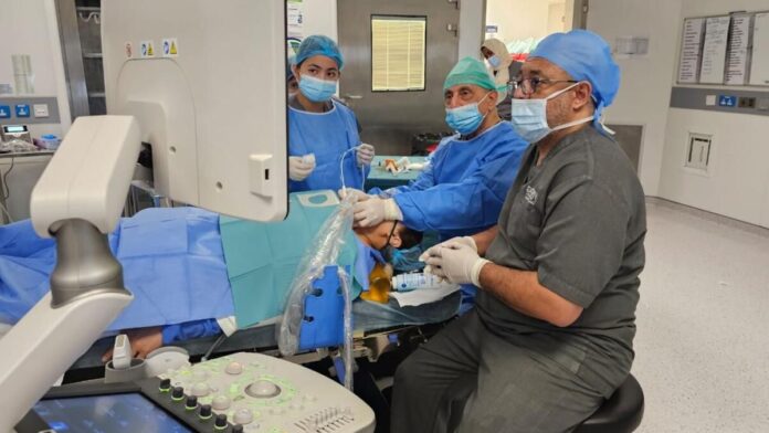Reem Hastanesi, endokrinolog danışmanı ve endokrinoloji anabilim dalı başkanı Dr. Aly Bernard Khalil’in öncülüğünde tiroid bakımında çığır açan bir başarıyı gururla kutluyor. Dr. Aly, son teknoloji termal ablasyon teknolojisini kullanarak sadece 20 dakikada devrim niteliğinde bir tiroid tümörü ablasyon prosedürünü başarıyla gerçekleştirdi. Bu yenilikçi yaklaşım, hastalara geleneksel ameliyatlara daha hızlı, daha az invaziv bir alternatif sunarak tiroid tedavisinde ileriye doğru önemli bir sıçramayı temsil ediyor.Reem Hastanesi’nde gerçekleştirilen dönüm noktası prosedürü, çevre dokulardaki bozulmayı en aza indiren, daha hızlı iyileşme süreleri ve komplikasyonların azalmasına neden olan ileri teknikler kullandı. Genellikle büyük kesiler ve uzun iyileşme süreleri içeren geleneksel tiroid cerrahisinin aksine, termal ablasyon, tümörü yok etmek için kesin olarak hedeflenmiş ısı kullanır. Doğrudan tümör bölgesine yerleştirilen küçük bir prob, sağlıklı tiroid dokusunu korurken tümör boyutunu küçültmek için kontrollü ısı sağlar.