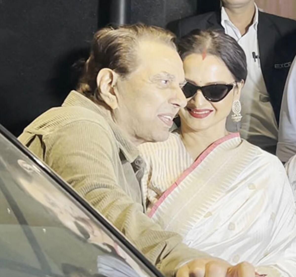 Çarpıcı bir altın ve beyaz ipek sari içinde zarafet yayan Rekha, imzası olan kırmızı sindoor ile çarpıcı bir görünüm kazandı. Paparazziler onu yakalarken, kameralar için zarif bir şekilde poz verdi ve mekanın dışında Dharmendra ve Aamir Khan ile gönülsüz bir sohbete girdi.