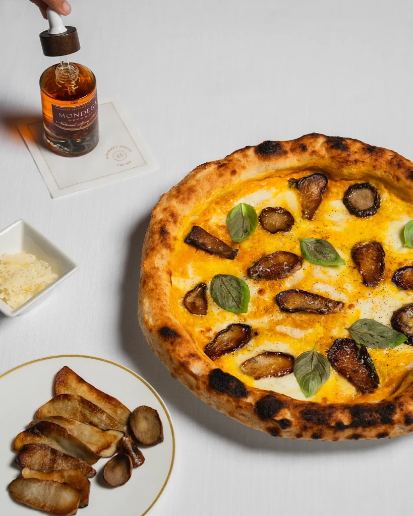 Oturduk ve Havyar Tadımı Menüsünü seçtik, daha az yemek gibi hissettiren ve daha çok özenle koreograflanmış bir yolculuk gibi görünen şeylere yerleştik. Deneyim, havyarla taçlandırılmış ince bir de Claire istiridye ve Sicilya kırmızısı karidesiyle zarif bir şekilde açıldı — temiz, tuzlu ve zarif, beklentileri hemen yükseltti. Oradan, havyar pizzetta ile işler daha hoşgörülü bir bölgeye taşındı: Wagyu tartarı ve Oscietra havyarı ile tepesinde gevrek ama havadar hamur. Çökmüş, evet, ama asla bunaltıcı değil.