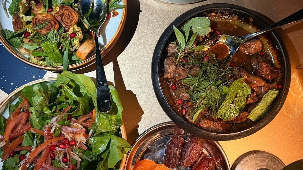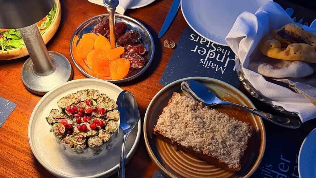 Ana yemek Meclis Şöleni olarak tanıtıldı ve gerçekten bir şölen gibi hissettirdi. Kuzu ouzi’nin yanında, yavaş pişirilmiş ve hoş kokulu pirinç ve hafif yoğurt sosuyla servis edilen kraliyet Arap karışık ızgarası vardı. Yayılma, her şeyden çok Ramazan toplantılarını tanımlayan cömertliği yansıtıyordu.