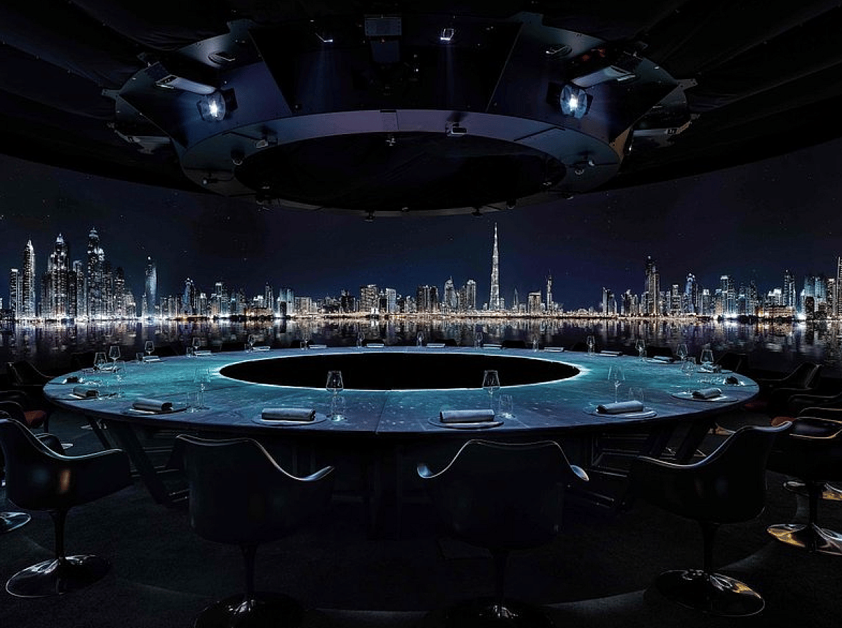 Katıldığımız ‘gösteri’, IF veya Imaginary Future olarak adlandırıldı ve uzayda başladı. 20 hevesli ziyaretçiyi ağırlayan dairesel oda, bizi doğrudan Samanyolu’na götüren ekranlarla çevrilidir. Duvarlardaki, masadaki ve gözün görebileceği her santimdeki görsel sanat, uzayda insanların fütüristik bir keşfini ve vizyonerlerin sonunda Dünya’nın sınırlamalarından kaçmak için kozmosu nasıl keşfedeceklerini gösterdi. Galaktik yolculuğa eşlik eden fütüristik yemekte, biri havyar, diğeri ton balığı ile doldurulmuş, deniz kestanesi miso çorbası eşliğinde iki gevrek ‘uzay ekmeği’ küboidi vardı.