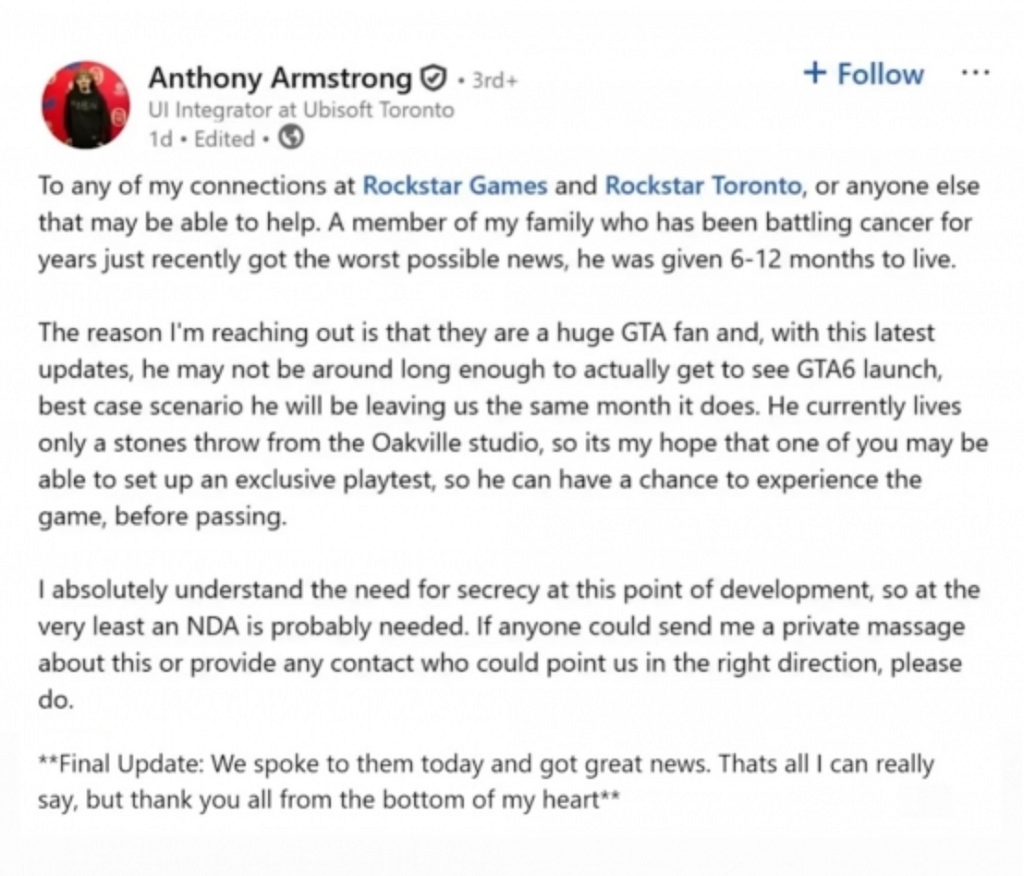 Armstrong’un son güncellemesine göre, hem Take-Two Interactive hem de Rockstar Games olumlu haberlerle ulaştı ve ölümcül hasta aile üyesinin gerçekten de oynama şansına sahip olacağını kuvvetle öne sürdü.
