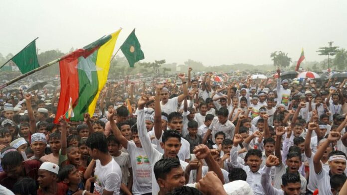 On binlerce Rohingyalı mülteci, onları kaçmaya zorlayan askeri baskının yedinci yıldönümünde Pazar günü Bangladeş’teki kamplarda bir araya gelerek şiddete son verilmesini ve Myanmar’a güvenli bir şekilde geri dönülmesini talep etti.
