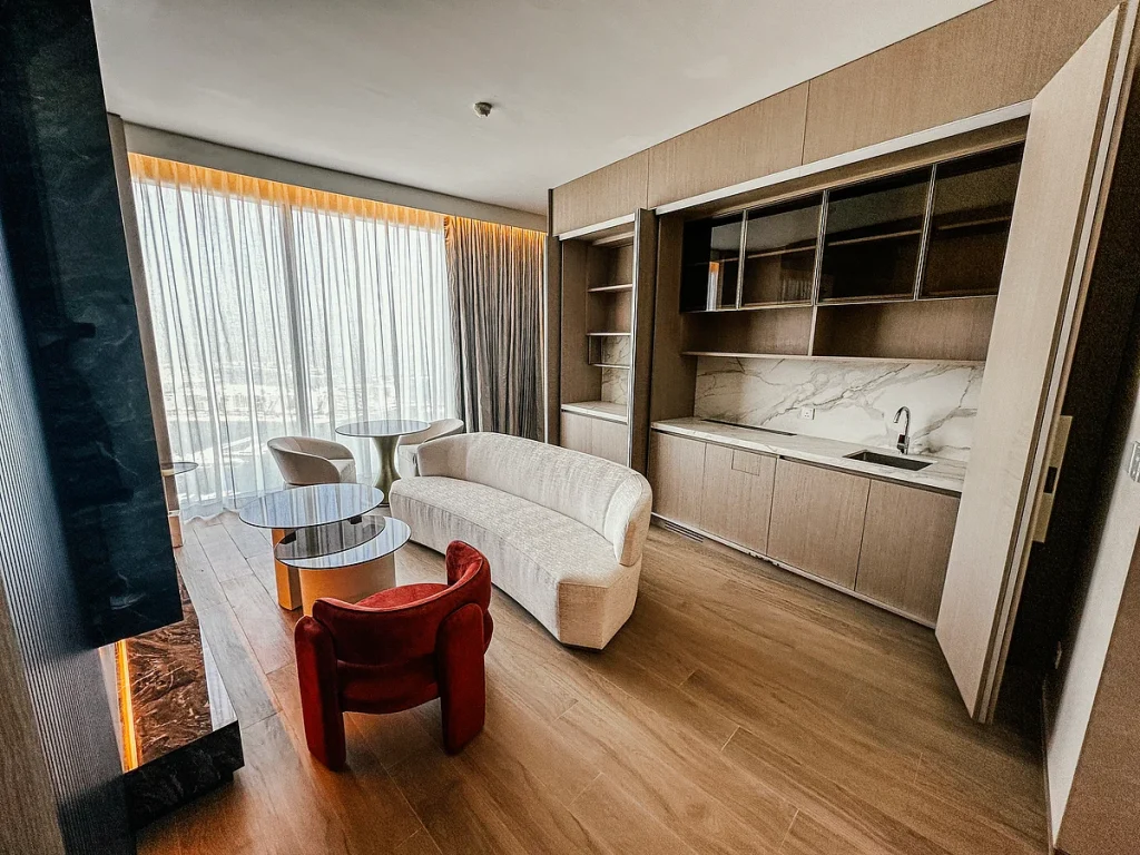 Minimalist mobilyalar, yumuşak bej, beyaz ve gri tonlar ve hafif kavisli aydınlatma armatürleri kulenin şeklini yansıtıyor.
