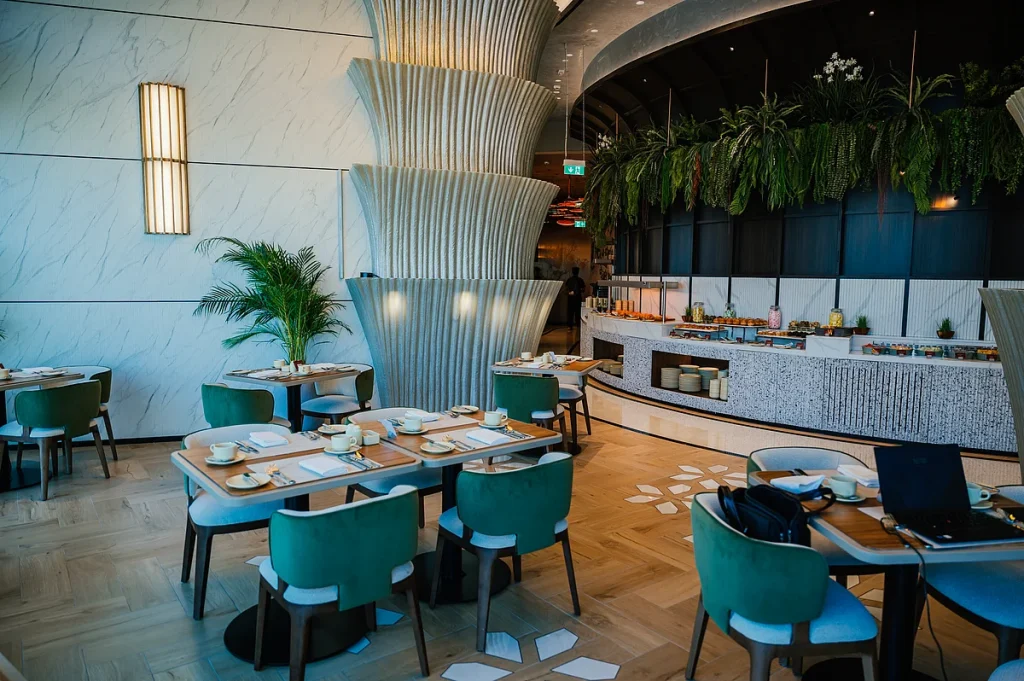 Otelin sekiz yemek mekanı vardır. Risen Cafe, girdiğiniz anda taze hamur işleri kokuyor. East14’te buharda pişirilmiş ramen ve dim sum kaseleri servis edilir. West13, Akdeniz tabakları ve el yapımı makarna getiriyor. Her şey farklı seviyelere yayılmıştır, bu nedenle otelden her geçtiğinizde şehri başka bir açıdan görürsünüz.Fitness severler için silüet manzaralı spor salonu 24 saat açıktır. Spa, şehrin üzerinde asılı olan 61. Kattadır.