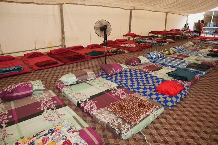 Tesiste 11 yatak odası ve uyku alanlarına dönüştürülmüş dört büyük salon bulunmaktadır. Ekip başlangıçta yaklaşık 100 şilte düzenlemişti, ancak daha fazla gezgin geldikçe kapasiteyi artırmak için çabaladılar.