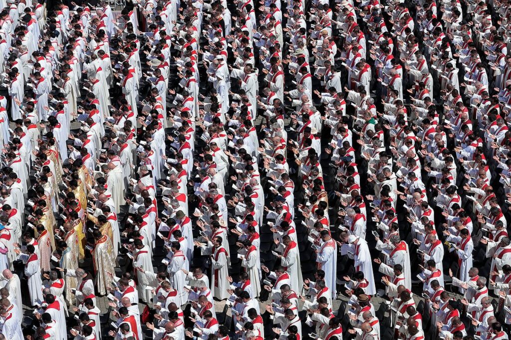 Vatikan’ın havadan görüntüleri, dünya liderlerinin karanlık giysilerinden siyah, yaklaşık 250 kardinalin kıyafetlerinden kırmızı, 400 piskoposun giydiği mor ve katılan 4.000 rahibin giydiği beyaz renklerden oluşan bir yama işi gösterdi.