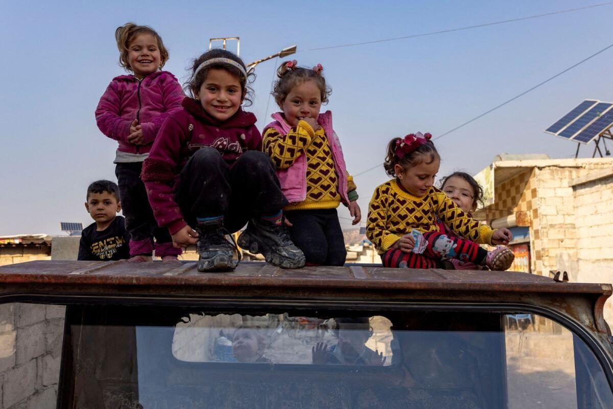 Diğerleri, Suriye’nin yeni yöneticileri tarafından kabul edilen bağımsızlık dönemi bayrağını sallayarak trafiğin arasında dolaşıyor.