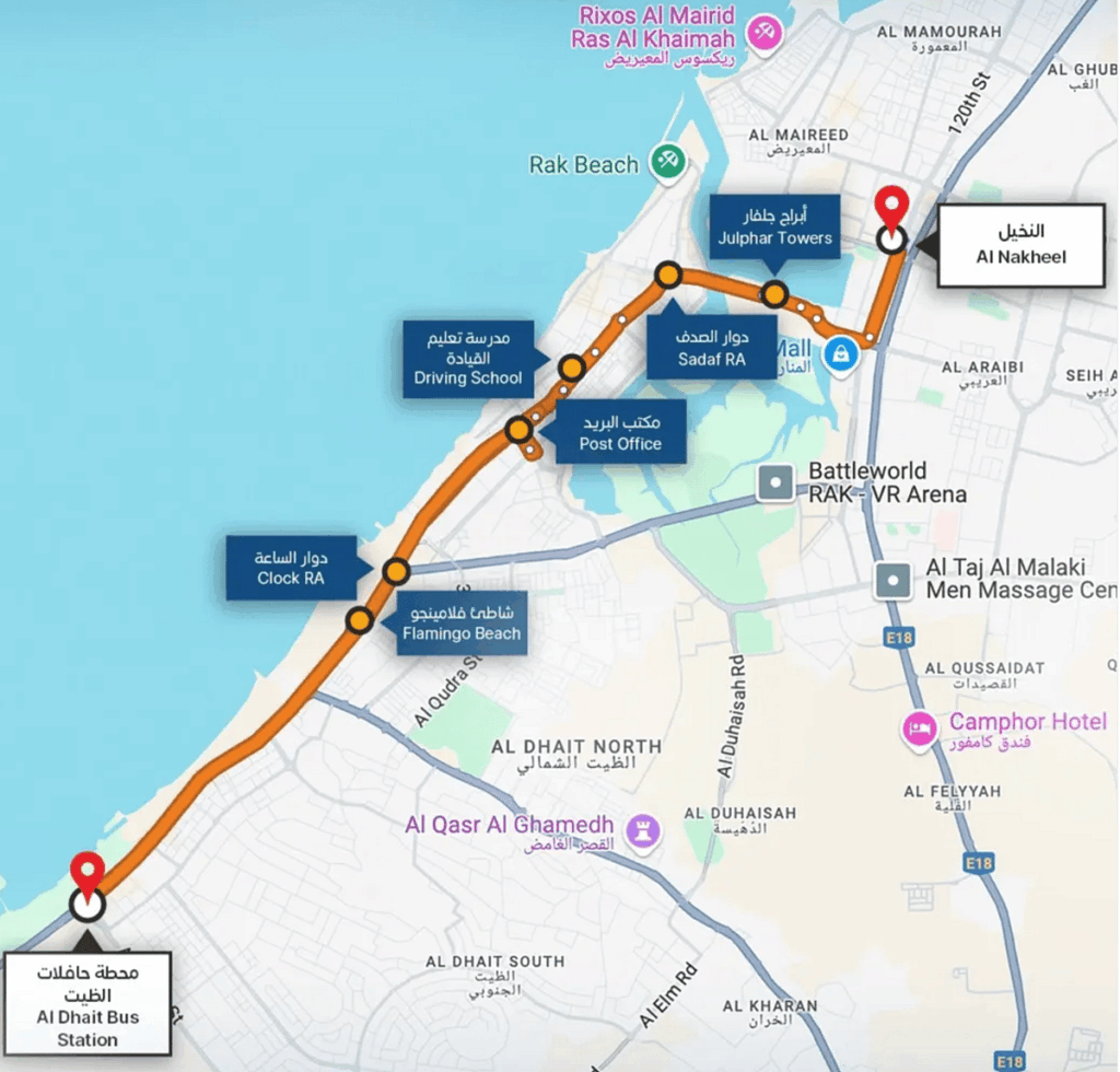 Turuncu Rota yolculuğu tek yön 25 ila 30 dakika sürecek ve 8 ana durak içerecek: Al Nakheel, Julphar Kuleleri, Al Sadaf Kavşağı, Sürücü Kursu, Postane, Saat Kavşağı, Flamingo Plajı ve Al Dhait south’taki Ana Otobüs Durağı.