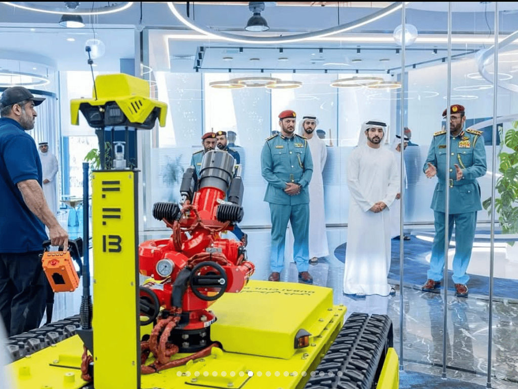 Şeyh Hamdan, ziyaret sırasında sivil savunma alanında yapay zeka uzmanlarıyla da bir araya gelerek yapay zeka araçlarının kullanımı ve yangınla mücadele ve kurtarma operasyonlarındaki en son yenilikler hakkında ayrıntılı bir brifing aldı. Duman içinde otonom hareket etmek ve olaylar sırasında binaların doğru 3D haritalarını oluşturmak için LiDAR teknolojisiyle donatılmış dört ayaklı bir robot olan ‘Kaşif Robotu’ hakkında bilgilendirildi.