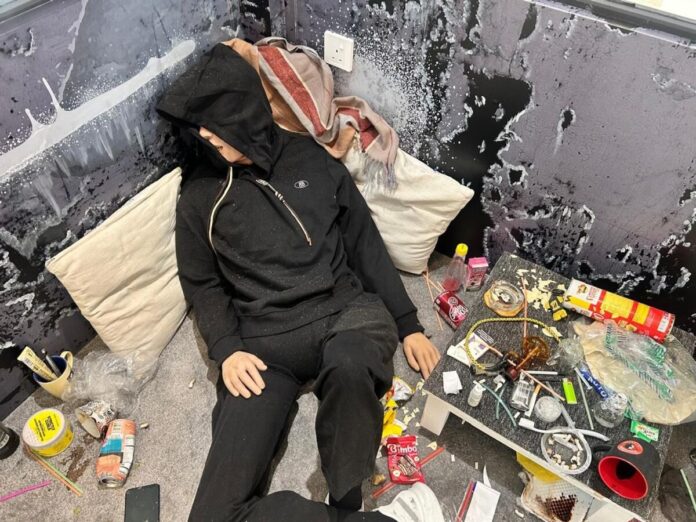 Sharjah alışveriş merkezindeki ürpertici bir gösteri, ultra gerçekçi bir sahne sunuyor: kirli bir zeminde, bir dizi uyuşturucu ve aletle çevrili genç bir figür bayılıyor. Etrafa saçılan aletler arasında, tümü kir ve artık yiyecek kaplarının zeminine yerleştirilmiş bir esrar borusu, şırıngalar ve buruşuk ambalajlar bulunur.Bu rahatsız edici tasvir, Zahia Şehir Merkezindeki ‘Ailem Benim En Büyük Servetim 2024’ başlıklı Sharjah Polis sergisinin bir parçası.14 Kasım’da başlatılan ve 21 Kasım’a kadar sürecek sergi, katılımcıları meşgul etmek ve uyuşturucu bağımlılığı ile ilgili tartışmaları teşvik etmek için etkileşimli içerik kullanıyor.Sergide ayrıca, toplumu etkileyen uyuşturucuların kapsamlı bir görünümünü sağlayan kristal metamfetamin, esrar ve sentetik esrar (baharat) dahil olmak üzere çeşitli narkotik türleri sergileniyor.
