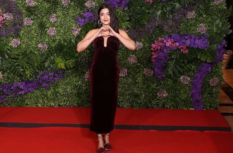 Rashmika, derin meyveli askısız bir elbiseyle başlarını çevirdi. Elbisenin dalgalı bir yakası ve figürü saran bir şekli vardı. Zarif ve çekici görünmesini sağlayarak gösterişli küpeler ve askılı topuklu ayakkabılar ekledi.