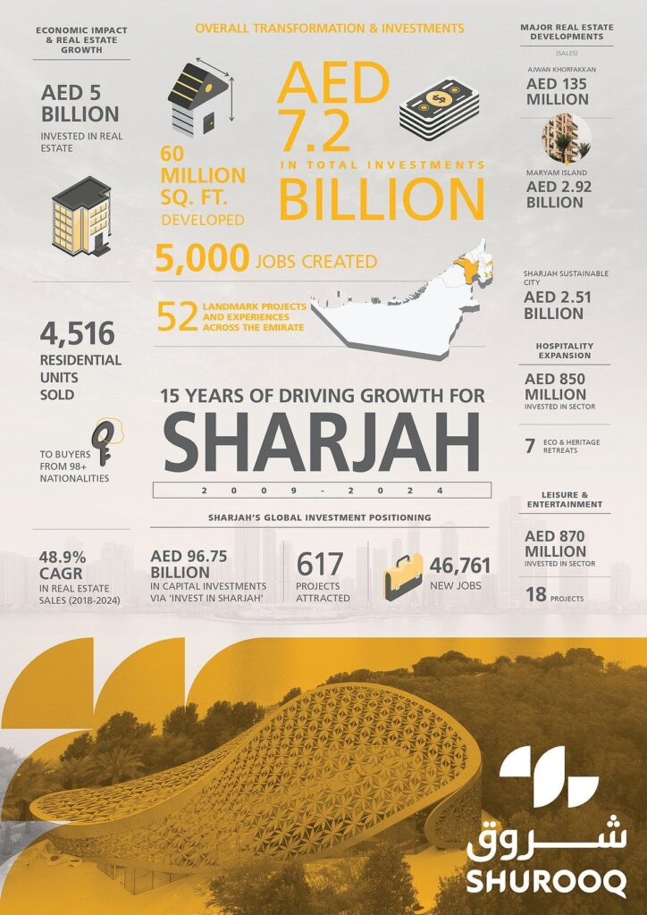 BAE’nin petrol dışı gsyih’sı, ülkenin petrol dışı gsyih’sının yüzde 7,6’sını oluşturan gayrimenkul sektöründen önemli katkılar gördü. Shurooq, 2018 ile 2024 yılları arasında gayrimenkul satışlarında yüzde 48,9 bileşik yıllık büyüme oranı (CAGR) kaydederek güçlü bir pazar büyümesi sergiledi. Kurumun gayrimenkul projeleri arasında dünya standartlarında üç gelişmede toplam 4.516 birim bulunmaktadır: Maryam Adası, Sharjah Sürdürülebilir Şehri ve Ajwan Khorfakkan. Bunlardan 4.187’den fazla birim satıldı. Bu projeler, Shurooq’un toplam 5 milyar Dh’lik gayrimenkul yatırımlarına ve ortaklıklarına katkıda bulunarak 98’den fazla milletten alıcı çekti. Bu olağanüstü başarı, Sharjah’ın silüetini önemli ölçüde şekillendirdi ve Shurooq’un bölgedeki gayrimenkul sektöründeki rolünü sağlamlaştırdı.