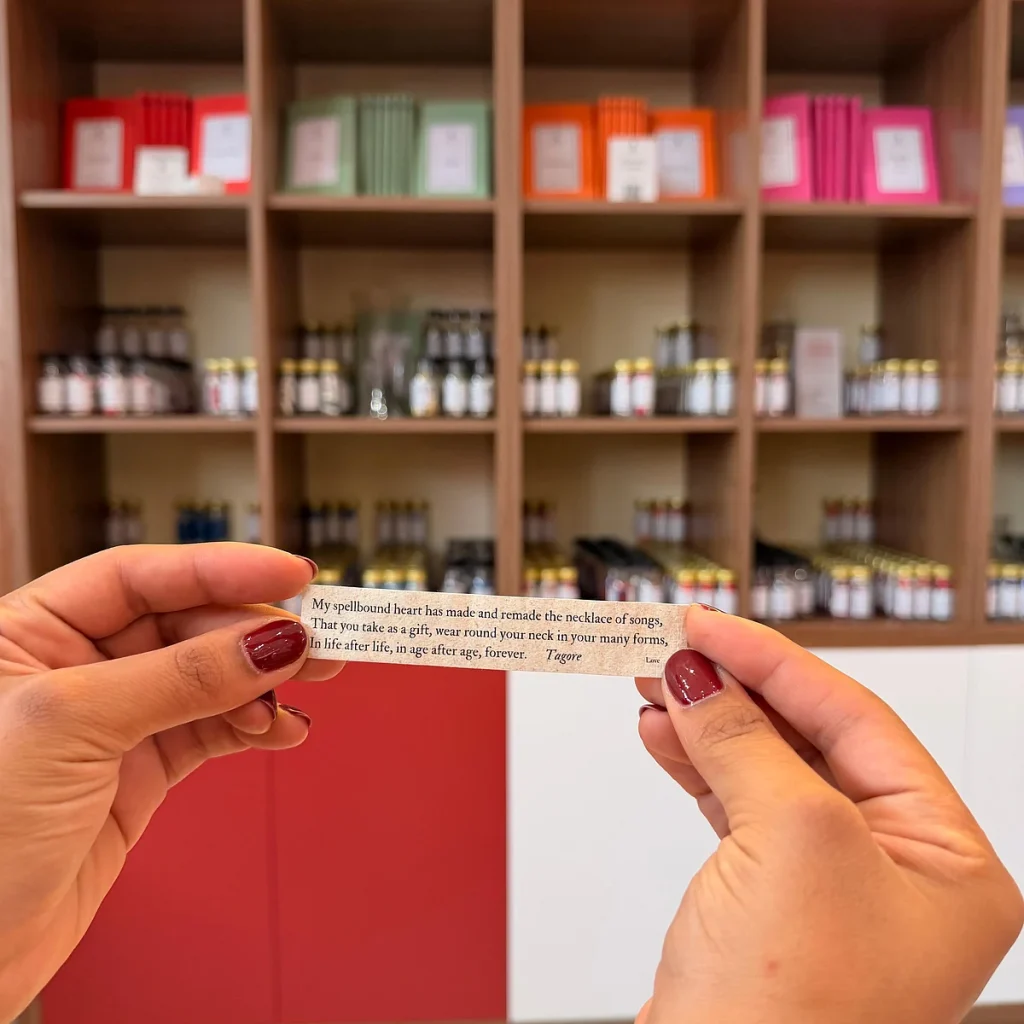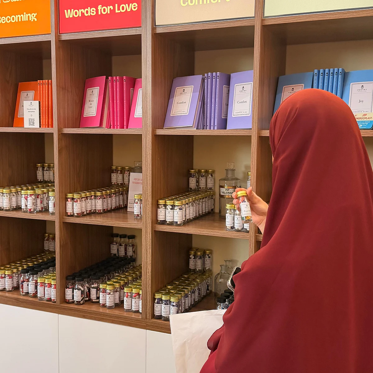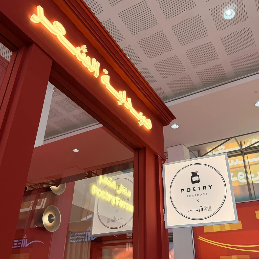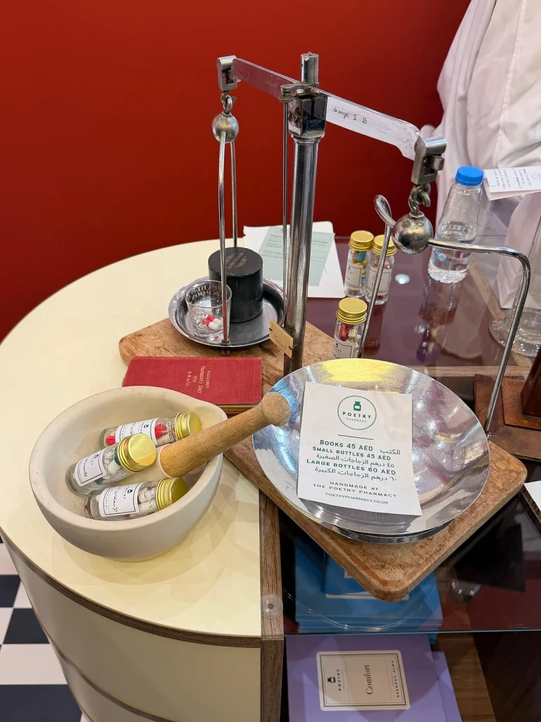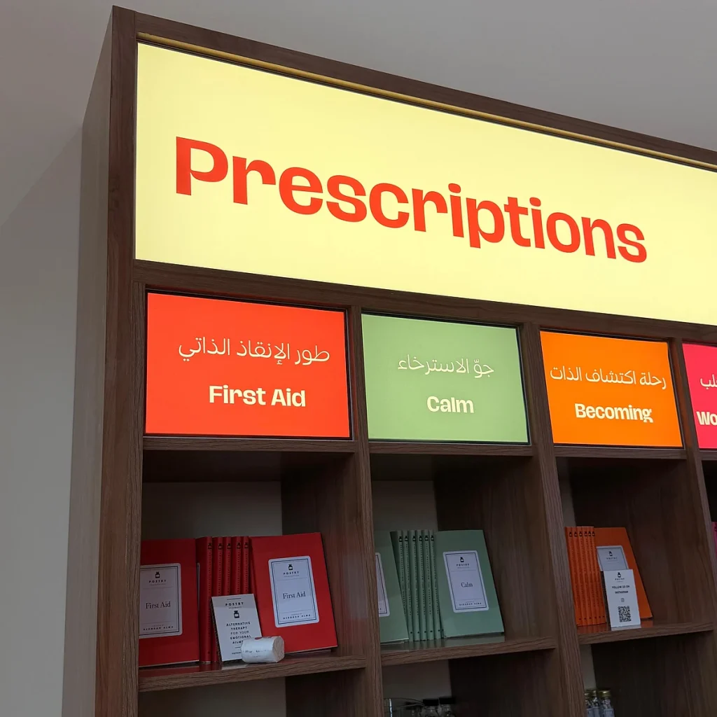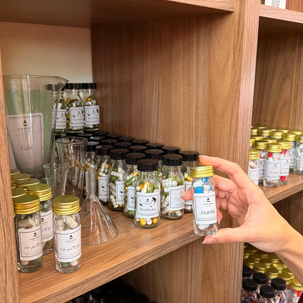 Sıbf’de durak, “Şiir Eczanesi” ile parlayan koyu kırmızı cephesiyle öne çıkıyor.” İçeride, teşhir kavanozlarından kitaplara kadar her şey, sakinleşmek ve yansımayı davet etmek için özenle düzenlenmiş hissediyor. Ziyaretçiler şişeleri Dh45 için veya eşleşen kitapları aynı fiyata satın alabilirler. Konfor ‘dan Sevinç ‘e kadar her kategori renk kodludur: huzur için mavi, aşk için turuncu, ilham için pembe.