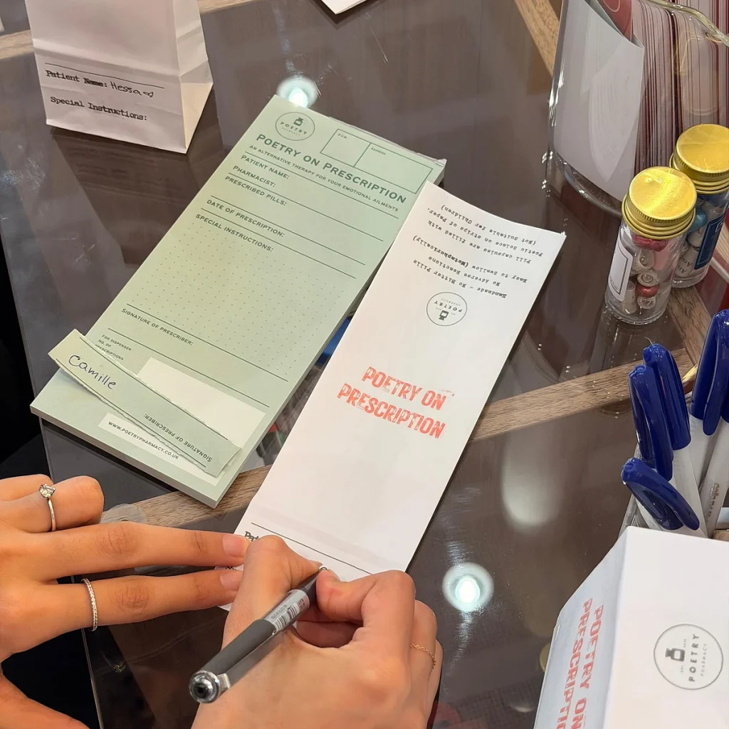 Standda ziyaretçilere Reçeteli Şiir başlıklı küçük kağıt reçete fişleri verilir. Beyaz önlükler giymiş ”eczacılar” ziyaretçinin adını dolduruyor ve bazen komik, bazen yumuşak bir doz kelime yazıyor. Kapsülün içinde Tagore, Emily Dickinson veya Maya Angelou’nun dar bir kağıda basılmış bir mısrası olabilir.