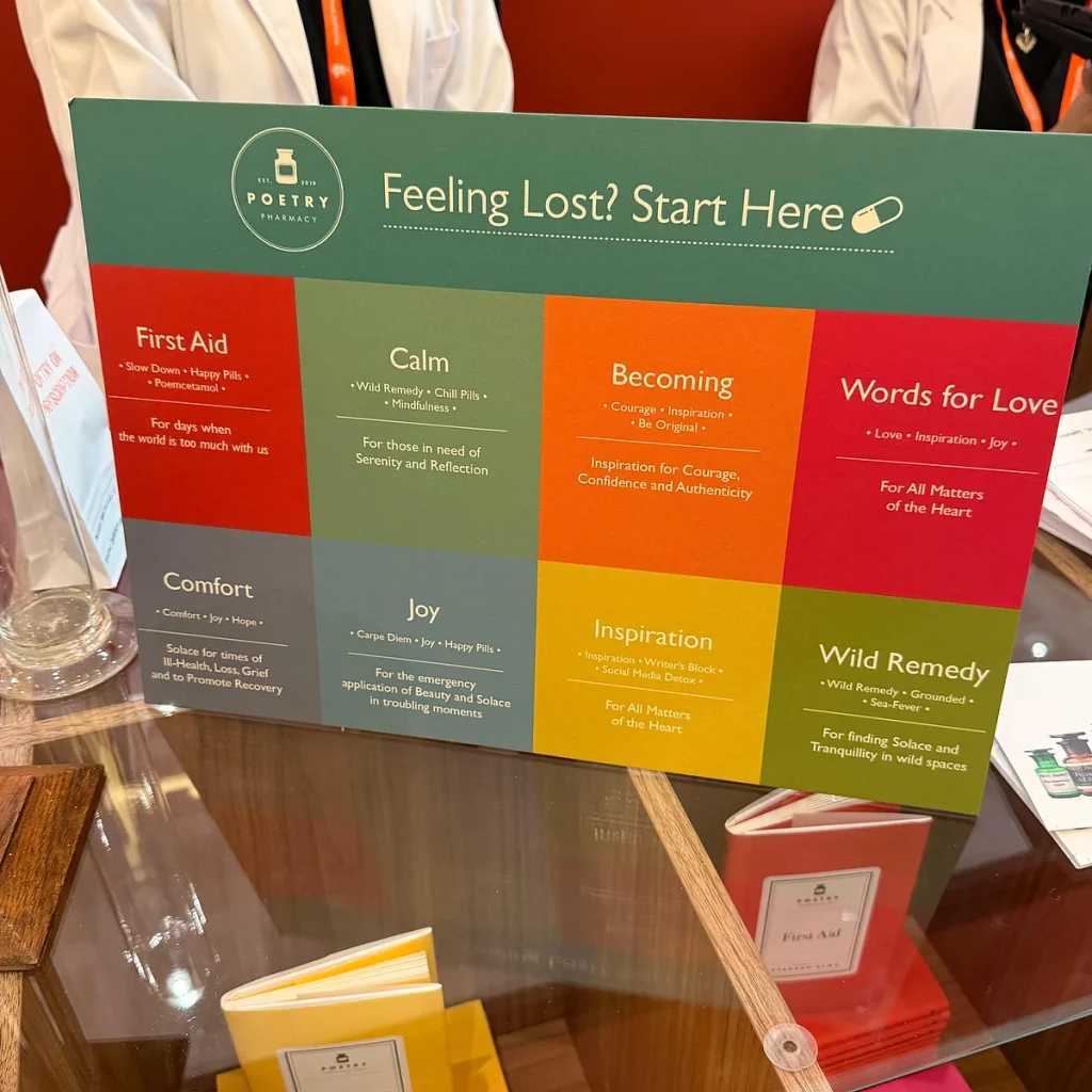Rahatsızlıklar için değil, duygular için bir eczanedir. Ziyaretçiler, parlak kırmızı ve sarı renkte Reçeteler işaretli raflardan kendi edebi muamelelerini seçerek göz atmak için duraklarlar. Yakındaki bir grafik kararsızlara rehberlik eder: Kaybolmuş Hissetmek? Buradan başla.her kategori altında şiirsel bir tedavi, “Dünyanın çok fazla olduğu günler için”, “Cesaret ve özgünlük için” veya “Kalbin tüm meseleleri için” bekler.”