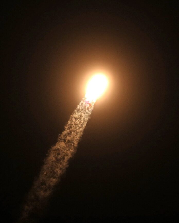 Güçlü roket yukarı doğru kükrerken kontrol odasında tezahüratlar çaldı ve gemi Dünya’nın Kuzey ve Güney Kutuplarına doğru yolculuğuna başlarken gece gökyüzünü uzun, turuncu bir alev bulutuyla aydınlattı.