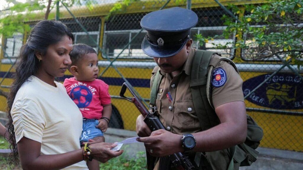 Bir polis memuru, Sri Lanka’nın Kolombo kentindeki parlamento seçimleri sırasında Perşembe günü oy kullanmaya gelen bir kadının seçmen makbuzunu kontrol ediyor. reuters