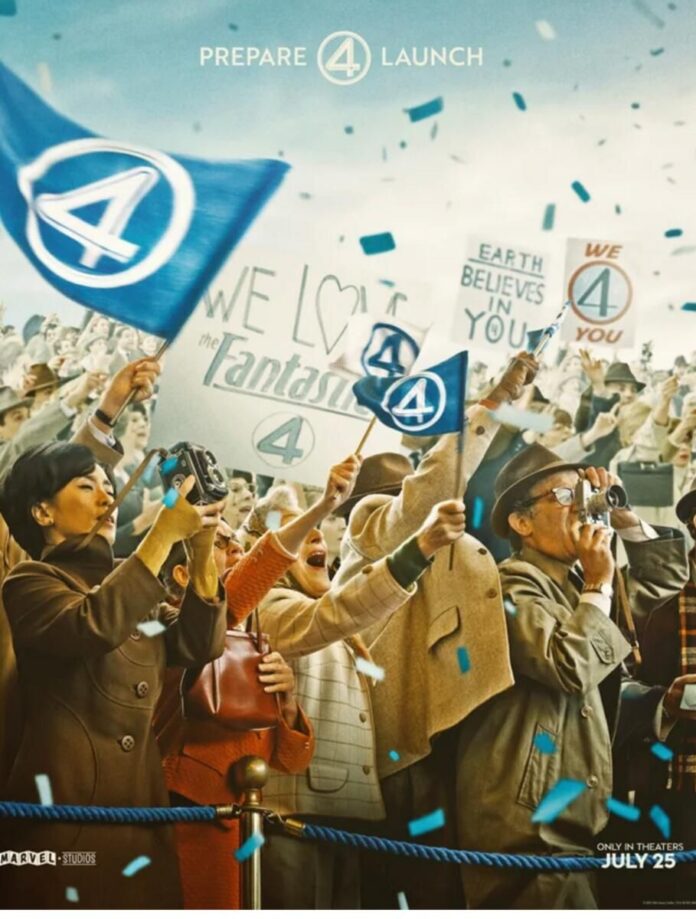 Posterde, bir süper kahraman görevinde uçuyormuş gibi görünen Fantastic Four’a el sallayan bir kalabalığın içinde duran 20. yüzyıldan kalma bir grup erkek ve kadın yer alıyor.