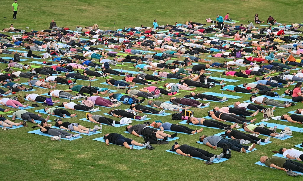Gün ışığı azaldıkça park, her yaştan ve fitness seviyesinden sakinleri kendine çeken geniş bir açık hava yoga arenasına dönüştü.