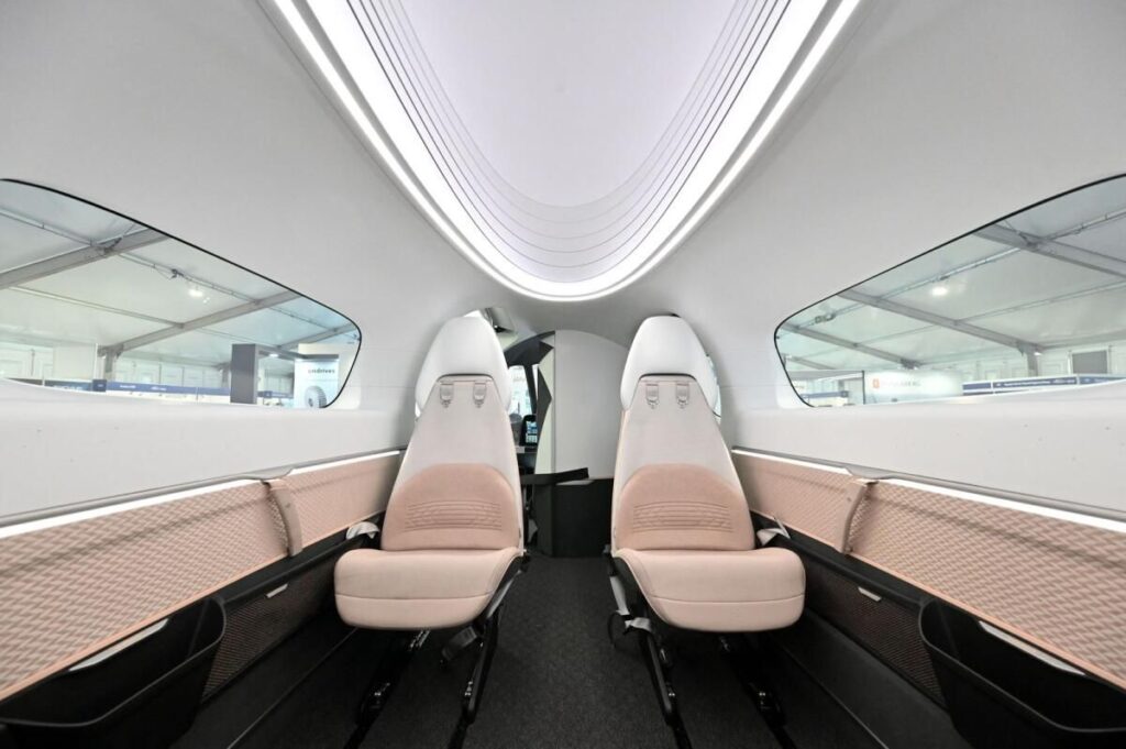 Londra’nın güney batısındaki Farnborough International Airshow 2024’ün açılış gününde, 22 Temmuz 2024’te elektrikli dikey kalkış eVTOL jeti olan Lilium Jet’in kabininin içindeki yolcu koltukları