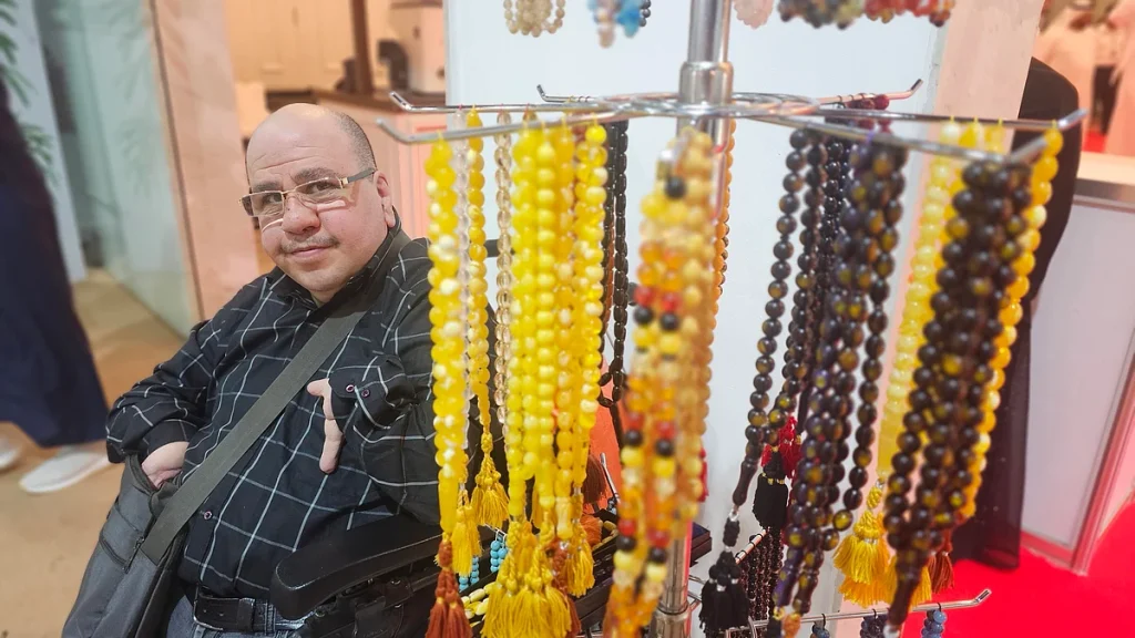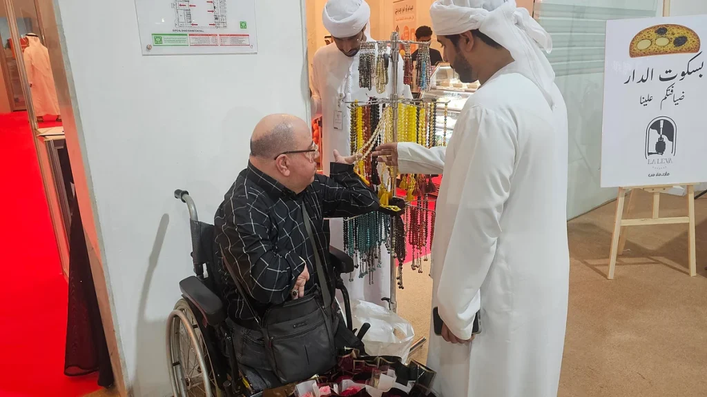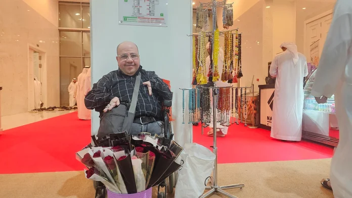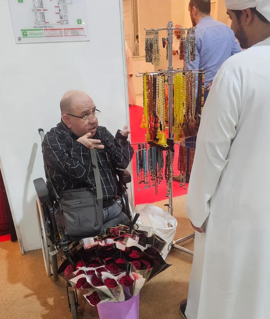 Tekerlekli sandalyesinde yüzünde parlak bir gülümsemeyle oturan Al Ain’de yaşayan Ürdünlü bir göçmen olan Sabir Fathi, sakatlığına rağmen her gün kendi elleriyle islami tespihler (tesbihler) yaparak saatler geçiriyor.