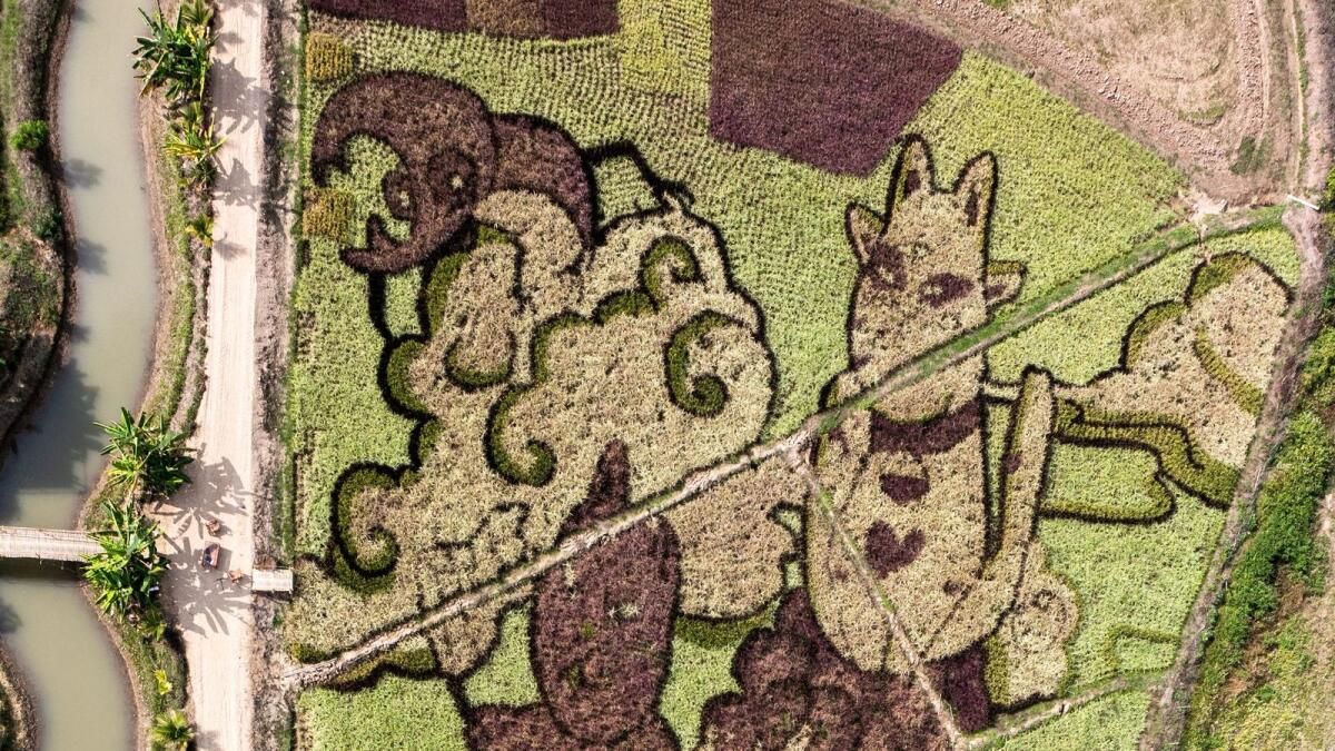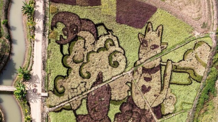 Kızıl bir ejderha, bir kedi tanrısı ve köpekler ve kediler, Tanyapong Jaikham’ın kuzey Tayland’daki pirinç tarlalarını kapsıyor, pirinç bitkilerinde Eylül ayında yakındaki bölgeleri sular altında bırakan ve binlerce kişiyi saran su baskınlarına canlı bir haraç.
