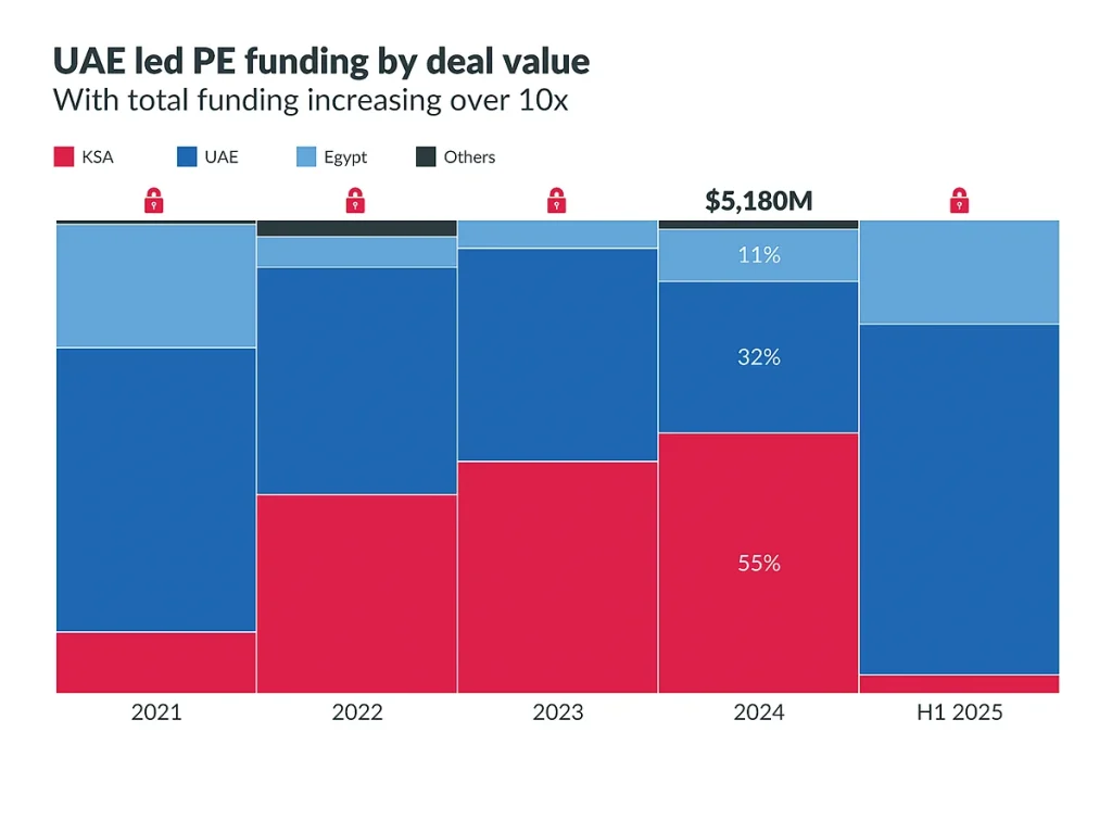 Geç aşama anlaşmaları hakim oldu ve yaklaşık 817 milyon dolar alırken, başlangıç aşamasındaki finansman sadece 32,7 milyon dolara geriledi. Erken aşama anlaşmaları, 2024’ten mütevazı bir artışla 167 milyon dolara ulaştı, ancak yine de bastırıldı. Yatırımcılar, bahisleri ince bir şekilde yaymak yerine sermayeyi ölçek artışlarına yoğunlaştırıyorlar. Kurumsal uygulamalar, fintech ve perakende, BAE’nin anlaşma faaliyetine öncülük etti. Vista Global’in 600 milyon dolarlık zammı ve Tabby’nin 160 milyon dolarlık E Serisi trendi örnekledi. Dubai, BAE anlaşma akışının% 90’ından fazlasını oluşturuyordu. Bu turlar 2025’in ilk yarısında yeni tek boynuzlu atlar basmasa da, Emirates’in ölçek büyütme merkezi olarak rolünü güçlendirdi ve güçlü yatırımcı güveninin sinyalini verdi.