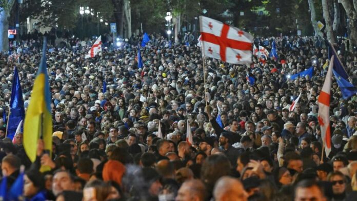 AFP muhabirleri, Gürcistan ve AB bayraklarını dalgalandıran on binlerce kişinin art arda beşinci protesto günü Pazartesi günü parlamento binasının önünde toplandığını gördü.