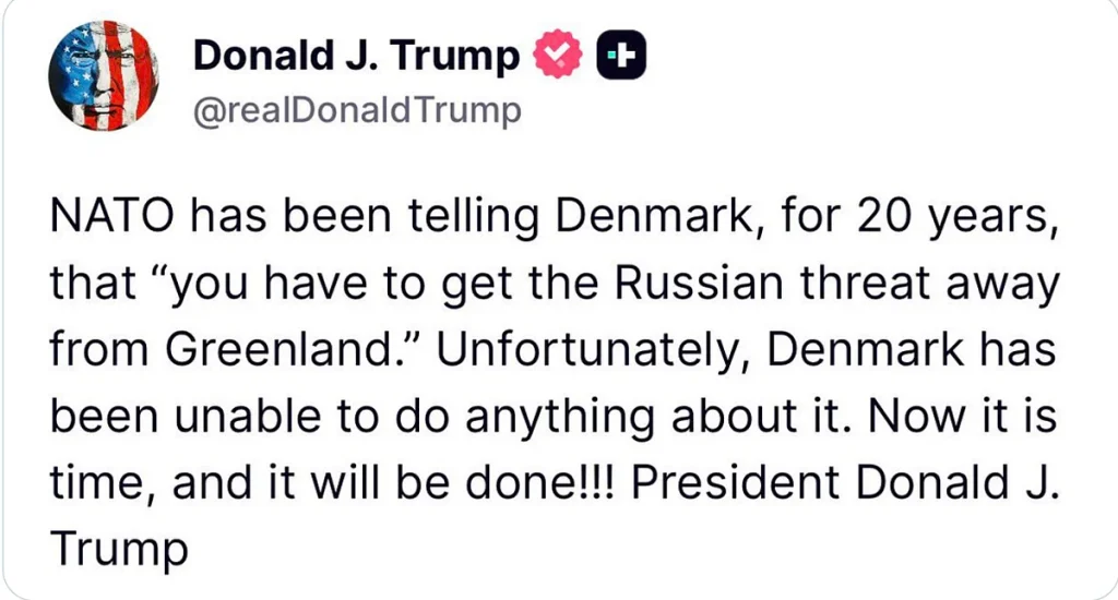 NATO, 20 yıldır Danimarka’ya, “Rus tehdidini Grönland’dan uzaklaştırmanız gerektiğini söylüyor. Trump, sahip olduğu sosyal medya web sitesinde Truth Social adlı bir yayında ” Maalesef Danimarka bu konuda hiçbir şey yapamadı” diye yazdı.