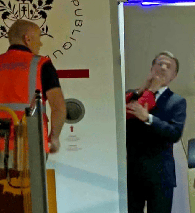 Görünüşe göre 72 yaşındaki Brigitte Macron’un kocasının yüzünü ittiğini gösterdi. 47 yaşındaki Macron irkilmiş görünüyordu ama çabucak iyileşti ve açık kapıdan el sallamak için döndü.