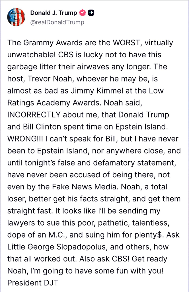 Açılış monologu sırasında, bunun Grammy’lere ev sahipliği yaptığı son yıl olduğunu kaydeden Noah, Trump’a açık bir selam olan “dönem sınırları” hakkında şaka yaptı. Daha keskin an daha sonra Yılın Şarkısı’nı tanıtırken geldi. Noah, ödülün “neredeyse Trump’ın Grönland’ı istediği kadar” beğenildiğini söyleyerek, Jeffrey Epstein’ın adasının gitmesiyle Trump’ın “Bill Clinton’la takılmak için yenisine ihtiyacı olduğunu” sözlerine ekledi.”