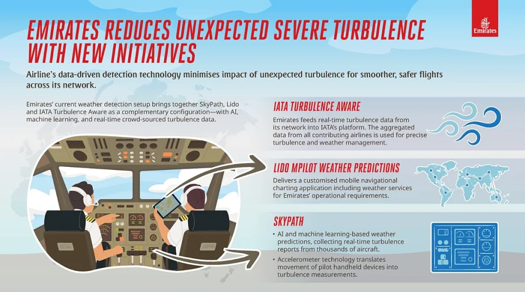 IATA Türbülans Farkında: Emirates, geçen yıl ıata’nın Türbülans Farkında Programına katıldığından beri Orta Doğu, Afrika, Asya ve Avustralya’daki geniş ağından gerçek zamanlı türbülans verilerine aktif olarak katkıda bulunuyor ve tüketiyor. Bu veriler, atmosferik koşulların kapsamlı ve gerçek zamanlı bir görünümünü sağlamak için dünya çapındaki katılımcı havayollarından gelen girdileri bir araya getiren ıata’nın küresel türbülans platformuna beslenir.