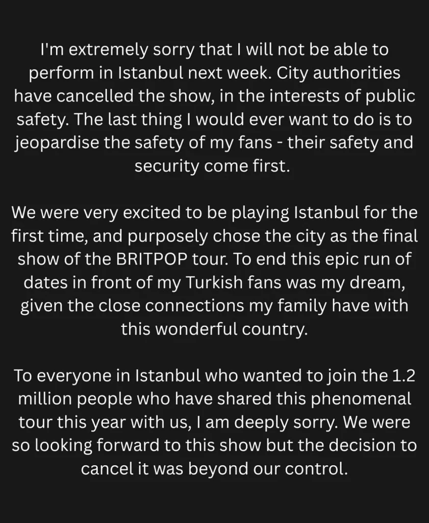 51 yaşındaki İnstagram hikayesinde “Önümüzdeki hafta İstanbul’da sahne alamayacağım için son derece üzgünüm” dedi.