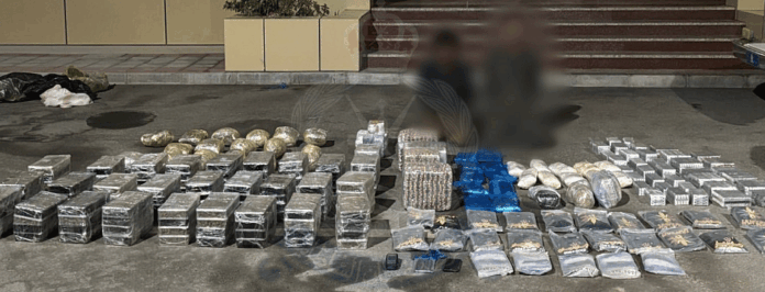 Yetkililer, şüphelilerin büyük miktarlarda kristal metamfetamin, esrar, esrar ve 68.000’den fazla psikotrop hap bulundurduğunu doğruladı.