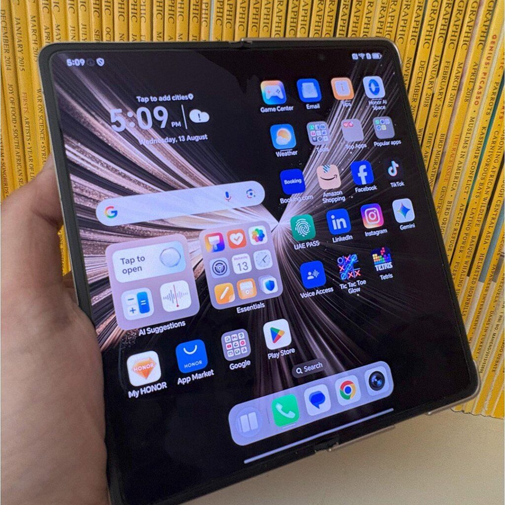 İçeride, ana katlanır ekran, normal kullanım sırasında esnek kalan ancak darbe altında kilitlenen ve akıllı bir ikinci koruma katmanı ekleyen Newton olmayan bir sıvı katmana sahiptir. Kullanımda, bu gerçek dünya huzuruna çevrildi. Menteşe güven verici derecede sert ve pürüzsüz hissediyordu ve ekran cep sıyrıklarında esneklik gösterdi. V5’i (yanlışlıkla) düşürdüğümüz birkaç kez ya da öylesine, zar zor çizileceğine dair bir gönül rahatlığı vardı ve tamamen zarar görmeden ortaya çıktığında uygun bir şekilde güvence aldık. Görünüşe göre Honor’un dayanıklılığı sadece koruyucu değil, derinlemesine tasarlanmış.