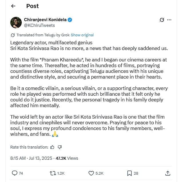 10’dan fazla filmde Kota Srinivasa Rao ile birlikte çalışan aktör Ravi Teja da üzüntüsünü dile getirdi. “Onu izleyerek, ona hayran kalarak ve her performanstan öğrenerek büyüdüm. Kota Babai benim için aile gibiydi, onunla çalışmanın güzel anılarını besliyorum. Huzur içinde yat, Kota Srinivasa Rao garu Om Shanti, “diye yazdı X.