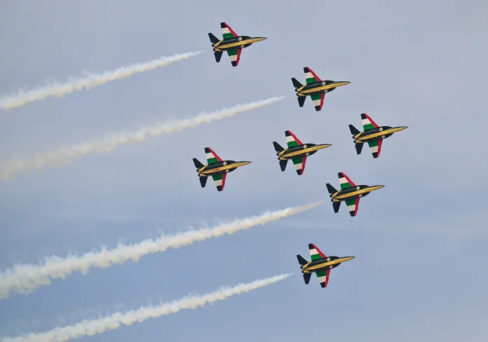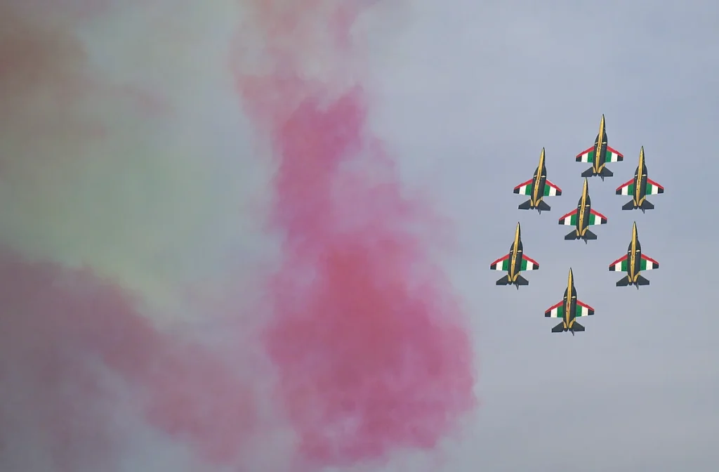 BAE bayrağının renklerine boyanmış yedi Fursan El Emarat jeti, bir film sahnesinden dümdüz bir formasyonda yukarı doğru ateş ederken, pembe dumanın ufku büyülü bir parıltıyla yıkarken gökyüzünü oyarken görülüyor.