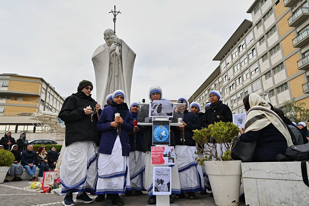 Katolikler, Francis için dua etmek veya çiçek, mum ve kart bırakmak için Gemelli’de toplanmaya devam ediyor.