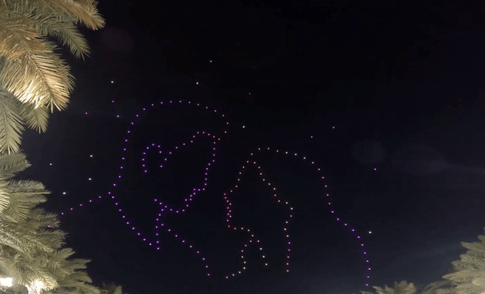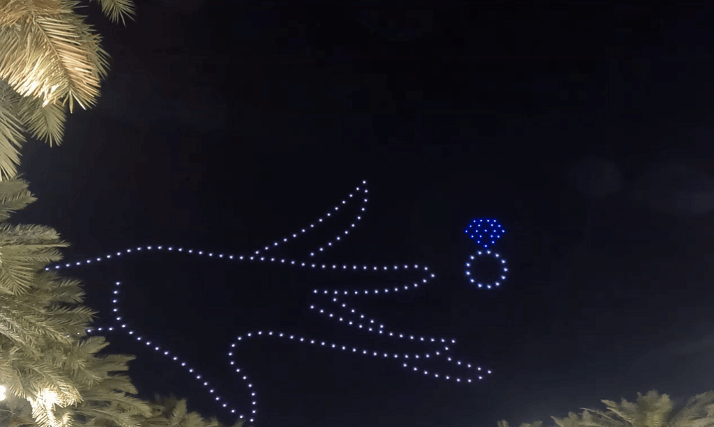 Geçen hafta Dubai’de düğün konukları, gece gökyüzünü aydınlatan ve çiftin aşk hikayesinden sahneler oluşturan 200 drone ile göz kamaştırıcı bir gösteriye maruz kaldılar — merkezde baş harfleri olan dev ışıltılı bir kalp dahil.