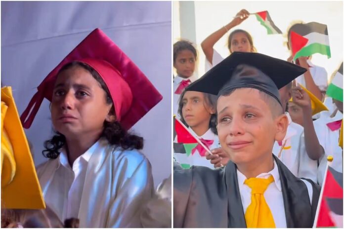 Filistinli gazeteci Abdallah Alattar’ın paylaştığı görüntüler hem iç açıcı hem de yürek burkan bir sahneyi yakalıyor: tören devam ederken sade önlüklü, bazıları gözyaşları içinde genç kızlar sessizce yüzlerini siliyor.
