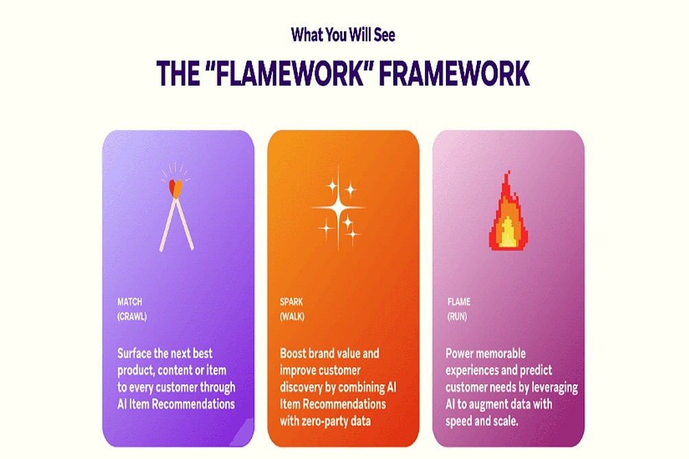 Markaların yapay zekayı anlamalarına yardımcı olmak için Flamework Çerçevesini oluşturduk. Bu metodoloji, markaların yapay zeka ile nerede olurlarsa olsunlar yeni fikirleri değerlendirmelerine ve uygulamalarına yardımcı olur. Yaklaşım üç düzeyde çalışır: Eşleşme, Kıvılcım ve Alev.