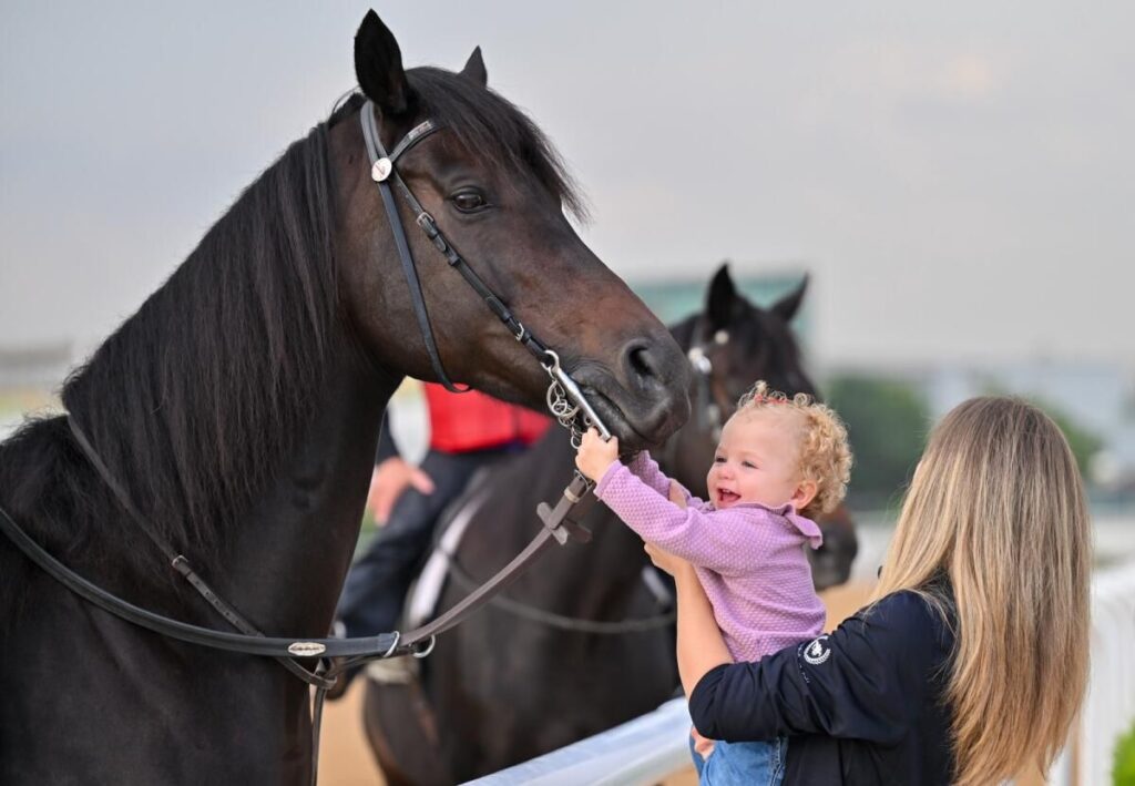Veronica ve kızı Isabella, Dubai’deki Meydan Hipodromu’nda düzenlenen Bayram Cuma Basın Toplantısında atla oynuyor