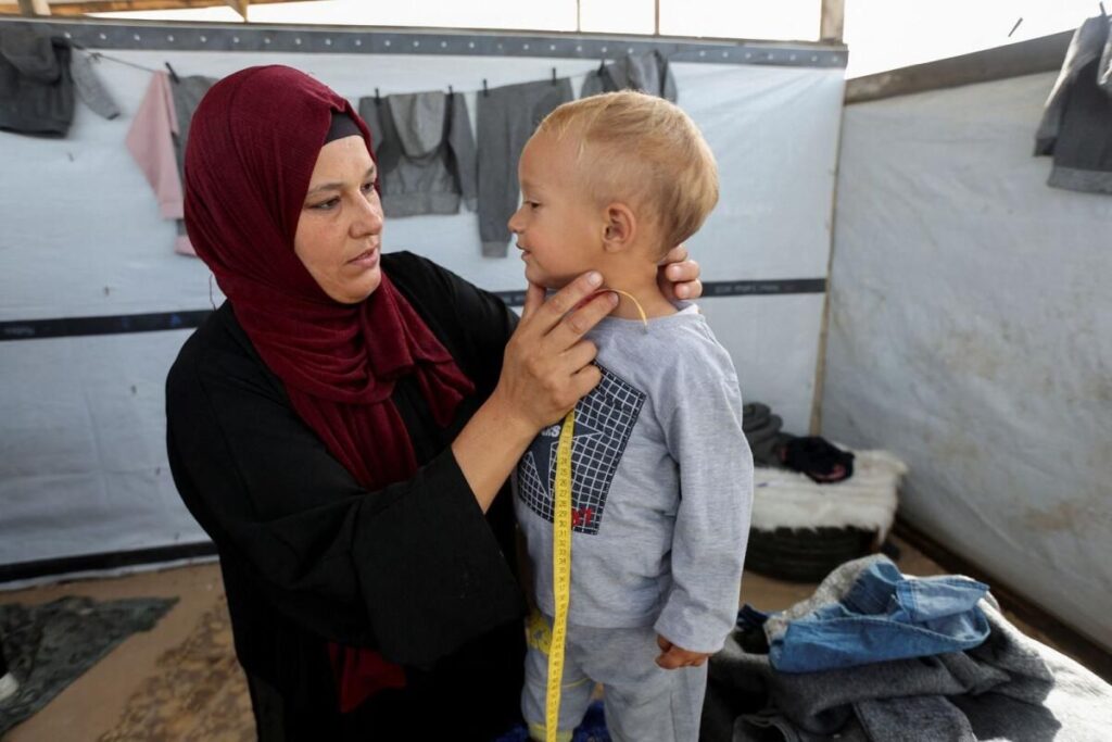 Filistinli bir kadın, yerinden edilmiş bir çocuğu, 26 Ekim 2024’te Gazze Şeridi’nin güneyindeki Han Younis’teki bir çadırda battaniyelerden kışlık giysiler yaratması için ölçer. – ReutersYakınlarda küçük bir çocuk masanın üzerinde dururken, başka bir kadın onu soğuk kıştan korumak için bir süveter için ölçtü.Attia, “Gazze Şeridi’ne kıyafet gelmiyor, bu yüzden kumaş eksikliğine nasıl bir çözüm bulabileceğimizi çok düşündük ve termal battaniyeleri kışlık kıyafetlere dönüştürme fikrini ortaya attık” dedi.Eylül ayında başlattığı “iğne ve iplik” girişimi çoğunlukla gönüllülere dayanıyor, ancak bazıları küçük bir ödeme alıyor. Giysiler 70 ile 120 şekel (18-30 $) arasında satılıyor ancak battaniye getirenler için fiyatlar daha düşük.Bir Gazze kışı, soğuk sıcaklıklar ve kuvvetli rüzgarlarla işaretlenmiş sert olabilir. Geçen yıl şiddetli yağışlar bazı sığınakları sular altında bıraktı.Bir yıldan fazla süren savaştan sonra, Gazze’deki pek çoğunun geliri yok. Bazıları ikinci el kıyafetler de dahil olmak üzere mallarını satmaya çalıştı, ancak çok azı temel malların fiyatlarını bile karşılayabilir.BM verilerine göre Gazze’ye giren uluslararası yardım miktarı tüm yıl boyunca en düşük seviyesine inerken, küresel bir açlık monitörü de başgösteren bir kıtlık konusunda uyardı.Gazze’deki yaklaşık iki milyon insanın çoğu, İsrail’in kıyı şeridine acımasızca saldırmasıyla yerlerinden edildi.“Bir yıldan fazla bir süredir yerinden edildik. Bir kış yaşadık ve şimdi kış tekrar geliyor, “dedi aslen Strip’in kuzeyindeki Gazze Şehri’nden olan ancak şimdi El Mevasi’de derme çatma bir barınakta yaşayan Samira Tamous.Down sendromlu 13 yaşındaki çocuğu “İğne iplik” projesi kapsamında yapılan kıyafetleri giyen Tamous, “Piyasada ve kızımı giydirmemek için kışlık kıyafet yok” dedi.İsrailli yetkililere göre, Gazze’deki İsrail saldırısı, Hamas militanlarının 7 Ekim 2023’te İsrail’e düzenlediği ve 1.200 kişinin öldürüldüğü ve yaklaşık 250kişinin rehin olarak Filistin yerleşim bölgesine geri götürüldüğü bir saldırı ile tetiklendi.Yerleşim bölgesi sağlık Bakanlığı’na göre Gazze’deki toplam ölü sayısı 43.000’e yaklaşıyor.