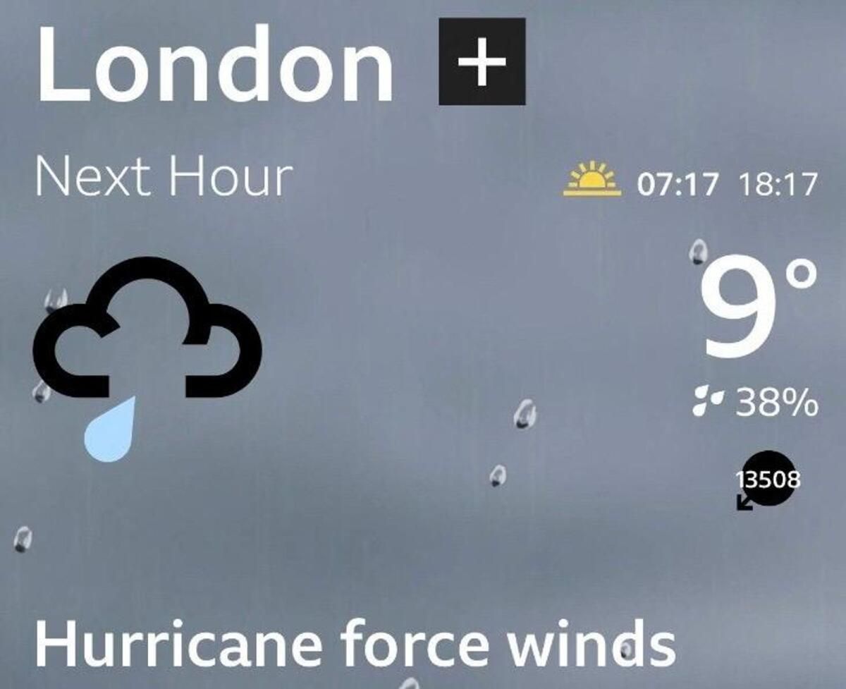 “Eve git BBC hava durumu uygulaması, sarhoşsun. Saatte yaklaşık 37 mil, “dedi one X kullanıcısı, 18.995 mil rüzgar hızını gösteren uygulamanın ekran görüntüsünün yanında Larky McRory kullanıcı adı altında yayın yapıyor.