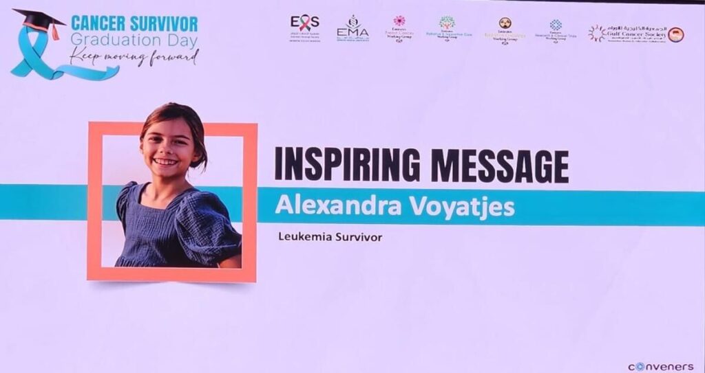 Emirates Onkoloji Derneği derneği, Körfez Kanser Derneği ile işbirliği içinde, ülkedeki tüm yaş gruplarından yüzlerce kanser mağdurunu onurlandırmak ve mezun etmek için Cuma günü Muhammed Bin Rashid Kütüphanesi’nde bir kutlama düzenledi. Alexandra da orada bulunanlar arasındaydı.Kanserden Kurtulanlar Ayı münasebetiyle düzenlenen etkinlik, kanser hastaları ve aileleri arasında umut aşılamayı ve toplumda kanserin öldürücü bir hastalık olmadığı bilincini yaymayı amaçladı.Emirates Onkoloji Derneği başkanı Profesör Humaid Al Shamsi, BAE’deki kanser tedavisi tesislerinin dünyanın ilk 10’u arasında yer aldığını söyledi.