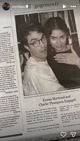 Başka bir gönderide Zendaya, nişanlı çift Emma Harwood ve Charlie Thompson olarak karakterleri hakkında daha fazla ayrıntı sundu.
